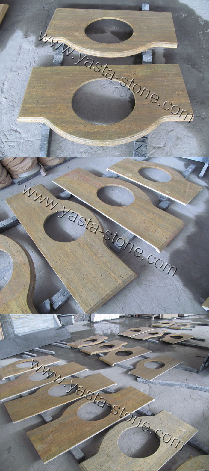 | Kashmir Gold granite vanity tops size 49"x22" with bowed front finished. Popular Vanity top sizes 25"x19"/22", 31"x19"/22", 37"x19" /22", 49"x19"/22", 61"x19"/22"(single or double sinks),or bowed front with 23" width. The vanity top with backsplash or side splashes are available. Edges eased&edge, Ogee edge, Radius edge, Full bullnose , Half bullnose, Bevel edge, Radius edge, Dupont edge, Laminated bevel, Laminated OG, Laminated bullnose. The vanity tops can be rough cut out, oval cut out, rectangle sink cut out, or custom cut. If you need vanity tops and sink with carton box packing ,we offer 17"x14" oval sink or 18 1/2"x13" rectangle sink. The ceramic sink can with or without UPC choice.Popular granite colors include tan brown, g682, santa cecilia, uba tuba, g603, china green, chengde green, ice blue, absolute black, giallo ornamental, blue pearl, black galaxy etc. |